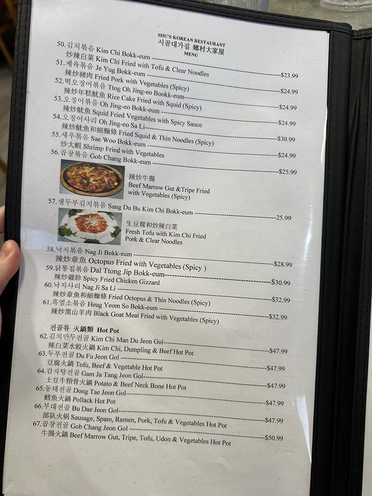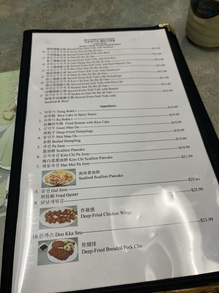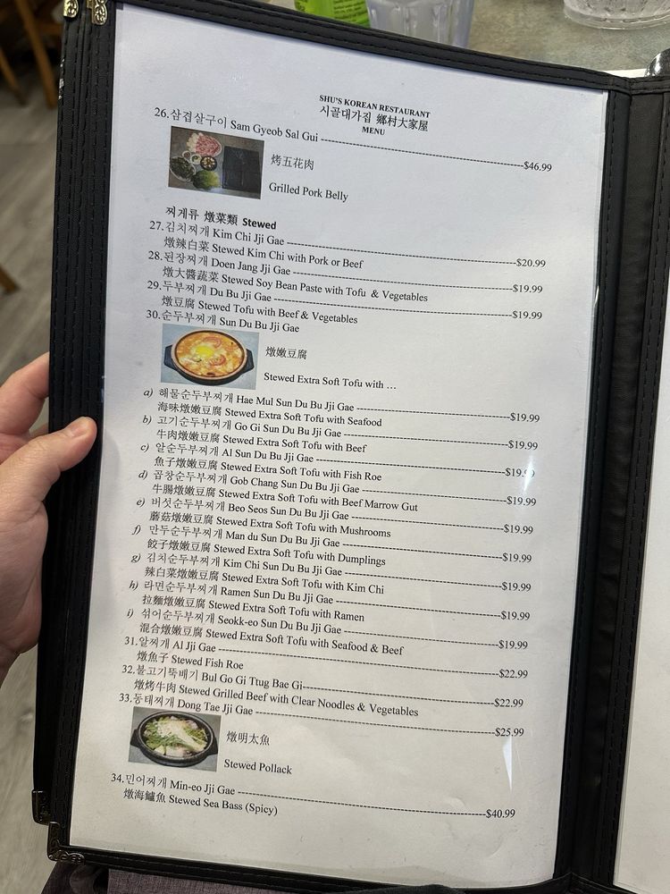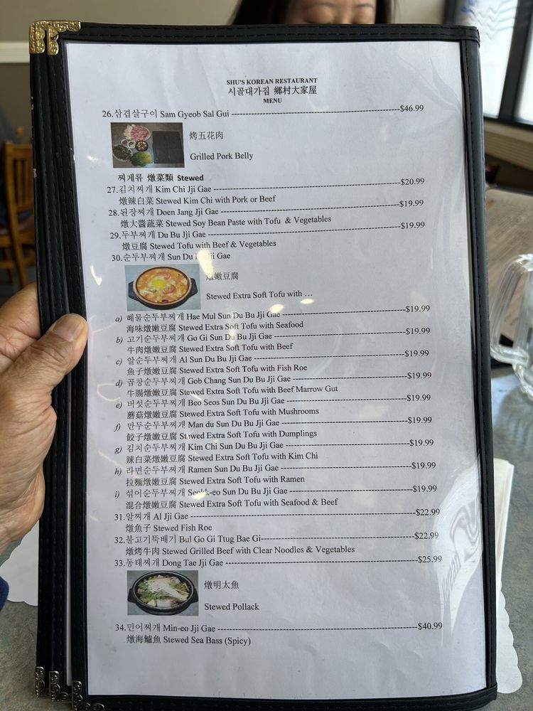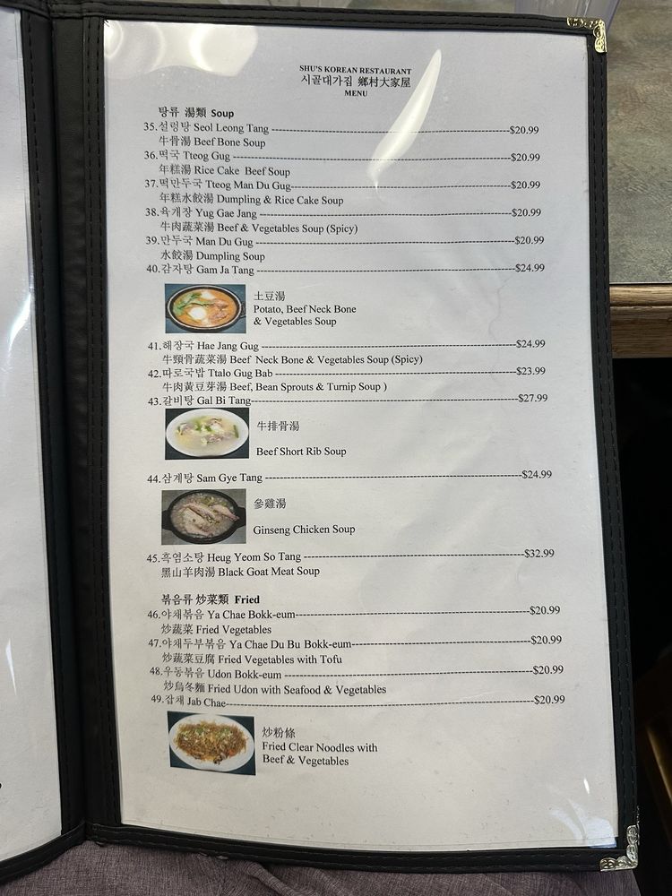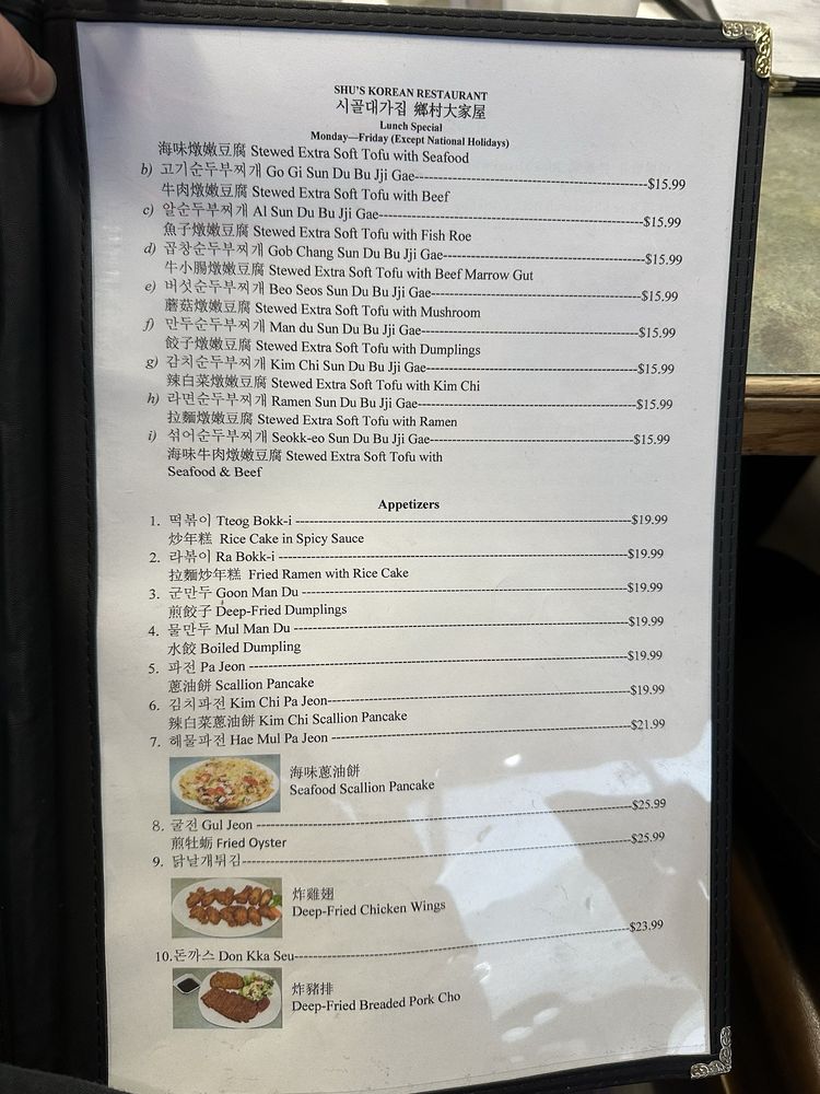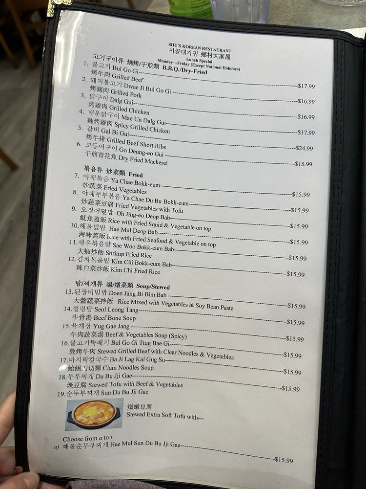 Shu’s Korean Restaurant, located in Santa Clara, CA, offers a variety of authentic Korean dishes with options for vegetarians and vegans. The menu includes delicious appetizers like Tteog Bokk-I and Mul Man Du, flavorful soups like Seol Leong Tang and Gam Ja Tang, and hearty stews like Kim Chi Jji Gae and Min Eo Jji Gae. Customers praise the quality and authenticity of the food, with favorite dishes being the bim bim bap and kimchi fried rice. The restaurant provides a casual dining experience with attentive wait staff and a welcoming atmosphere. With ample seating for groups and a diverse menu, Shu’s Korean Restaurant is a great choice for those looking to experience traditional Korean cuisine.